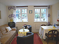 2-Zimmer-Ferienwohnung im EG mit Gartensitzplatz, ca. 36 qm, Wohnzimmer mit Doppelschlafcouch, Esstisch, Kabel-TV und offener Küche. Schlafzimmer Doppelbett. Modernes Bad mit schwellenfreier Dusche. Gut geeignet für Gehbehinderte und Rollstuhlfahrer (Türbreite 73 cm); keine Stufen und Schwellen. Zwei weitere Apartments für 2 und 4 Personen im selben Haus . | |||